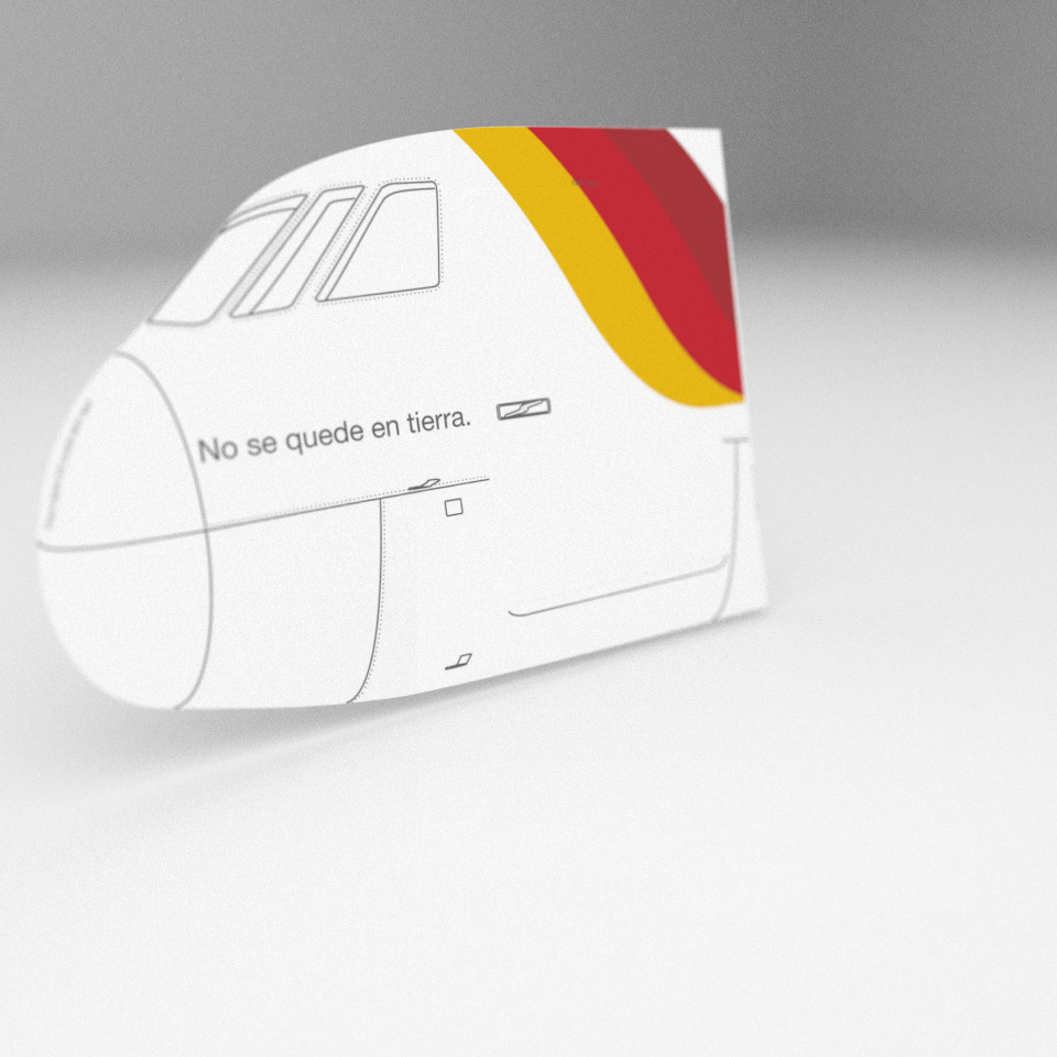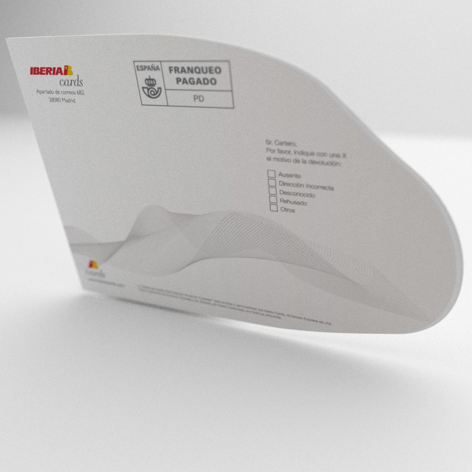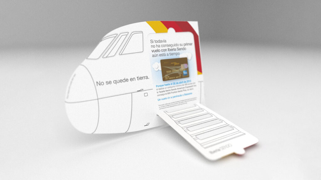 Design for mailing promoting Iberia Travel Cards. By using that card in your trips you get Avios that may result in other rewards. this fidelization system is shared with British Airways. The complet is perforated on one side so it opens discovering the message inside inviting the recipient to board in the Avios program.