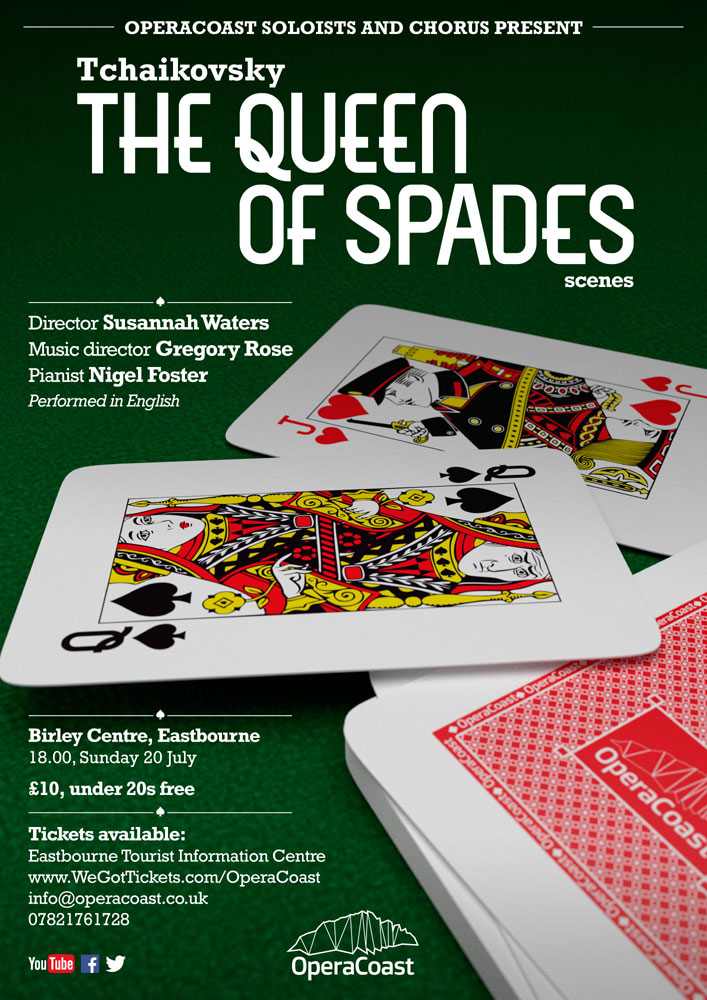 This was the first of many projects I worked on for OperaCoast. Based on Tchaikovsky’s opera, the poster should reflect the characters and the atmosphere of the gambler’s solitude in despair.